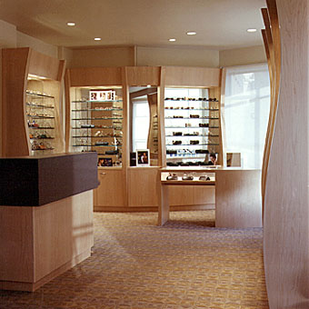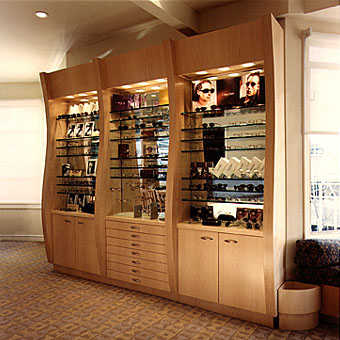 ![]() When Dr. Kevin Denny decided to add an eyeglass dispensery to his opthamology practice, we suggested this S-curved design. We spent many hours with Dr. Denny and his staff, figuring out how to make the small space alloted to the dispensary accomodate its many functions, but the result was well worth the effort. |
